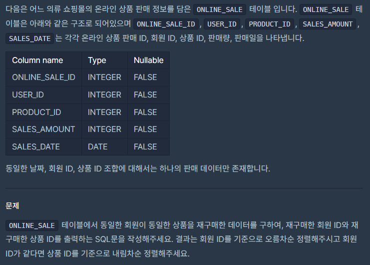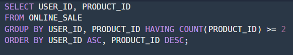 # 재구매가 일어난 상품과 회원 리스트 구하기